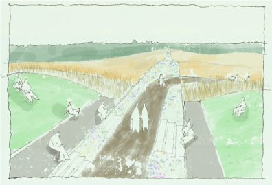 In alignment with the path at this point of arrival would be a swath of wildflowers, perhaps sunflowers as well as other species that are native and offer different blooming times and repetitions so that the effect is preserved through the spring and summer. The swathe is meant to connect to the promontory on the west edge of the arboretum, and is meant to recall the wildflower strips that farmers add between their crops to help with pollination and resistance to pests and disease. The benefits to avoiding a monoculture in growth have long been known to the farming community, and we hope that the idea of the propagation of new ideas and new growth is a foundational idea to the path.