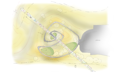 The path also maintains an even slope of just under 5% as it rises through the trees that exist on the site. These trees are handy because they can serve as milestones marking progress along the path. To complement them, we anticipated widening the path at changes of direction to allow for people to rest or gather. The widened edges are drawn in the same way as the letters and graphic design in Celtic knots, which place an emphasis on continuity.